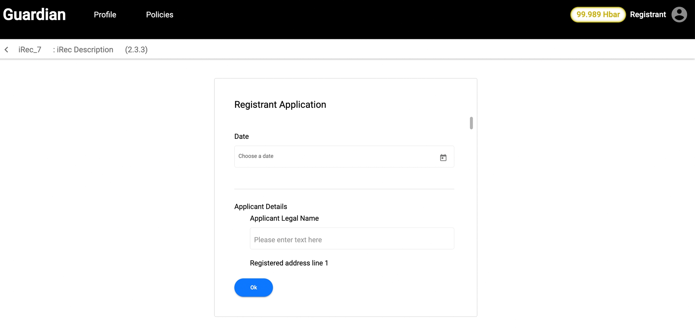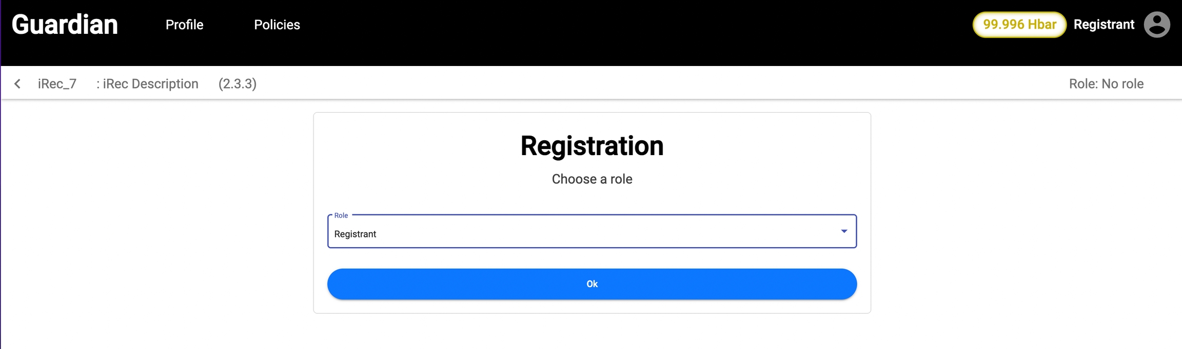 4. Once the policy is published, we will logout and login as Registrant.Once we login as Registrant, we will setup Registrant role by selecting Standard Registry from the dropdown, generating Operator ID and Operator Key as shown below: