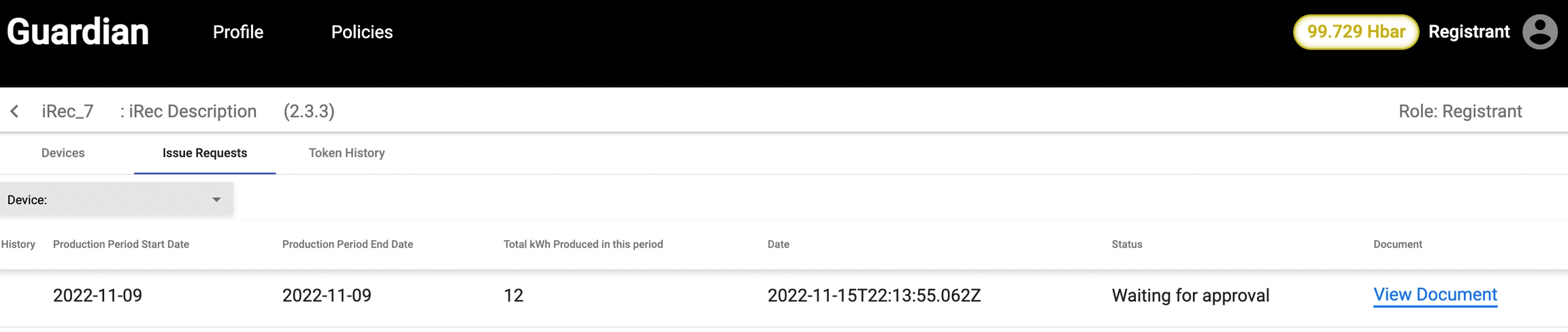11. We login as SD and view the Issue Request and approve it by clicking on approve button. Once Issue request is approved, tokens are minted if the MRV data is more than 1000 KW as it is the threshold for splitting the data into chunks.