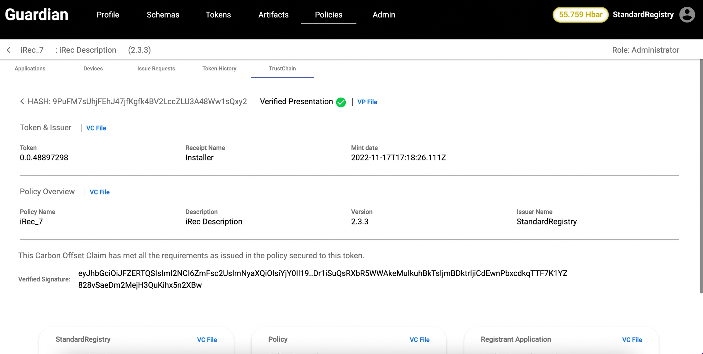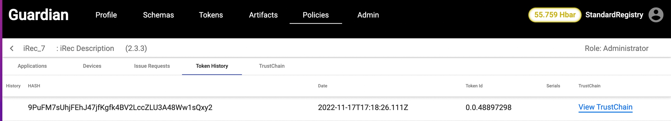 12. We can check the Tokens minting status and Trustchain in Token History tab of Standard Registry: