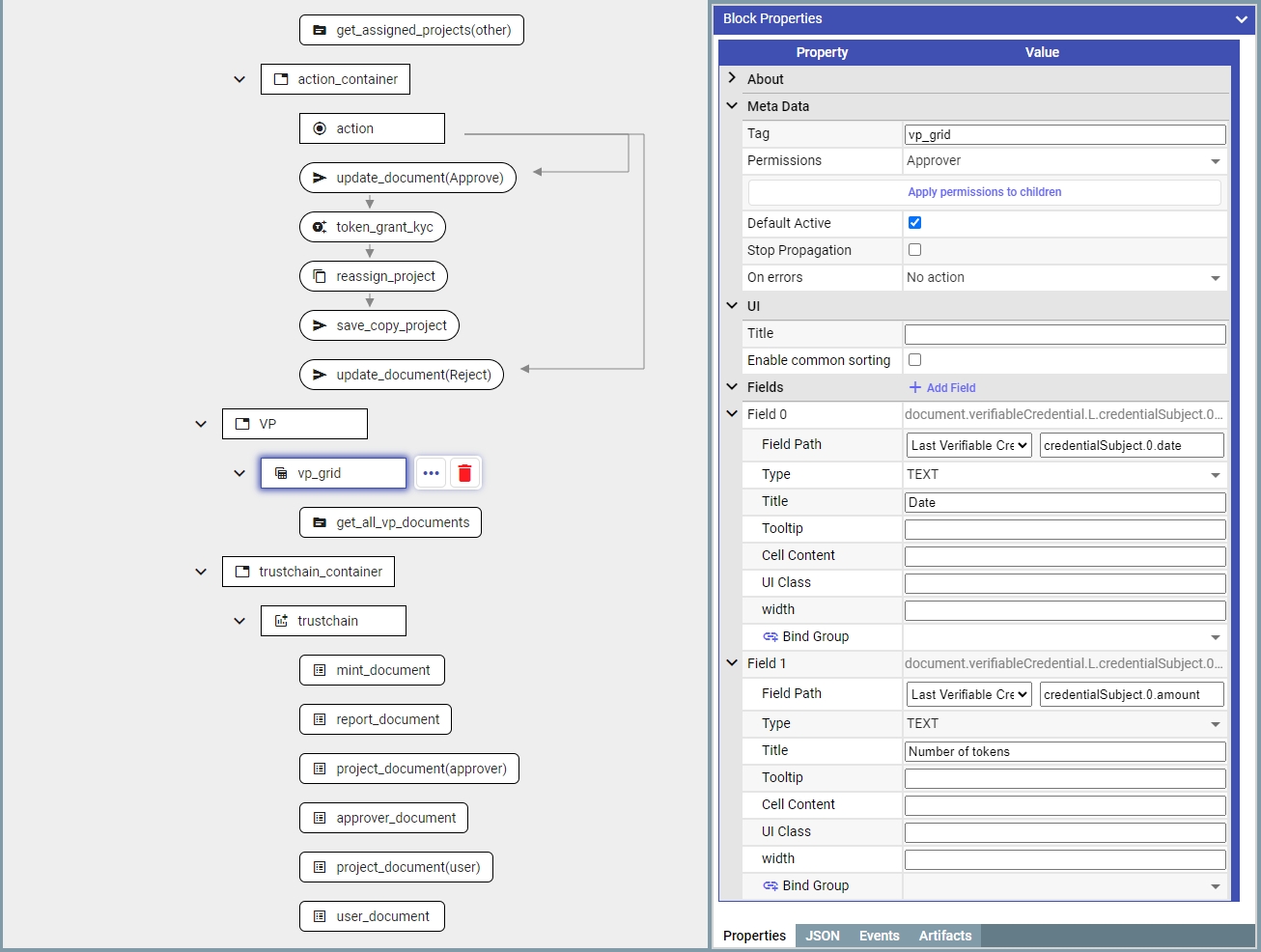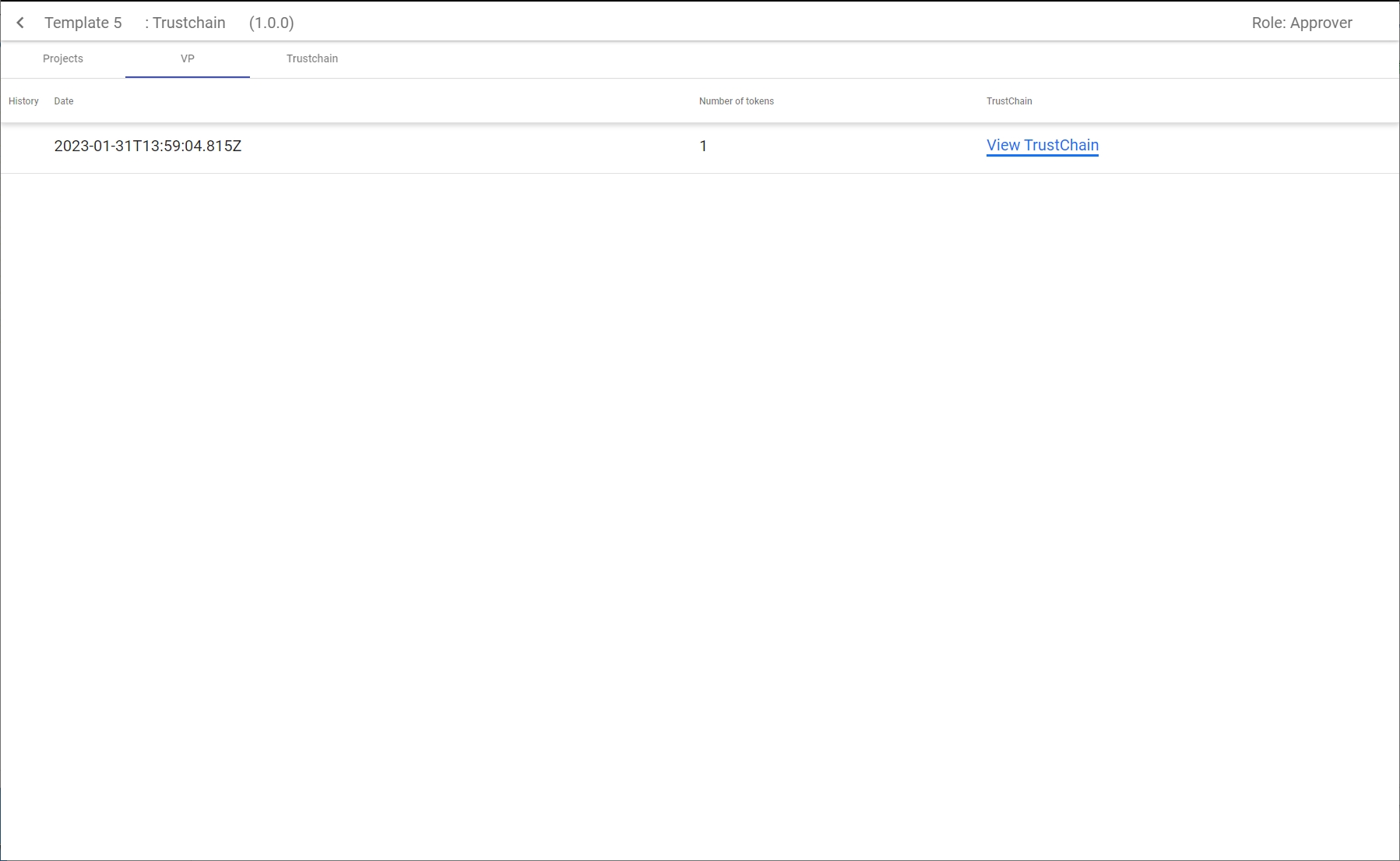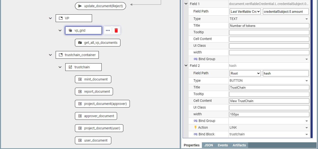 To activate the ‘reportBlock’ an id or a hash of the VP document is needed, we will add the grid containing the list of the VP documents and links to the trustchain.