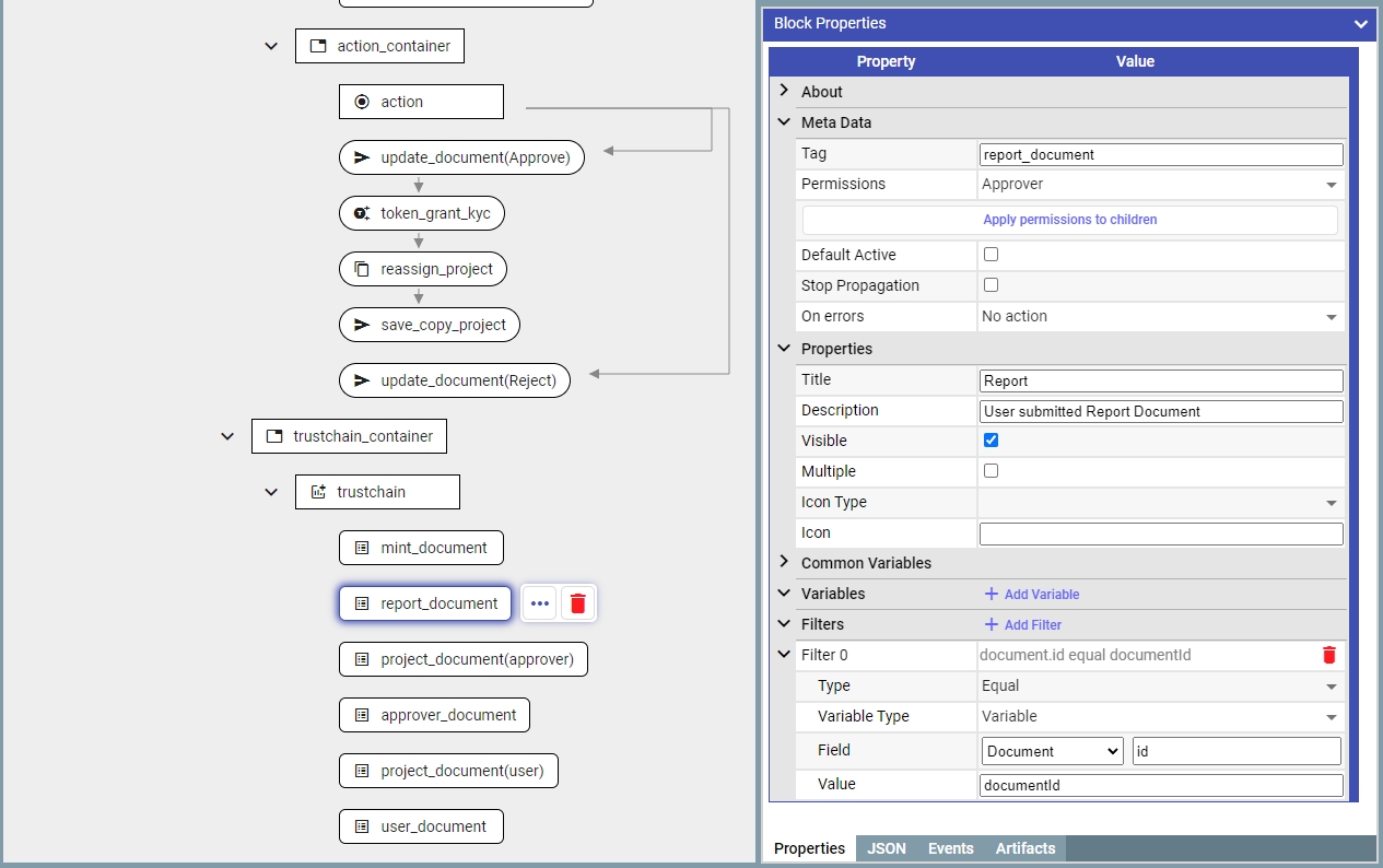 In Guardian policy ‘reportBlock’ finds VP documents based on their id or hash and displays document information, related policy and token information. To retrieve the linked information ‘reportItemBlock’ must be used.