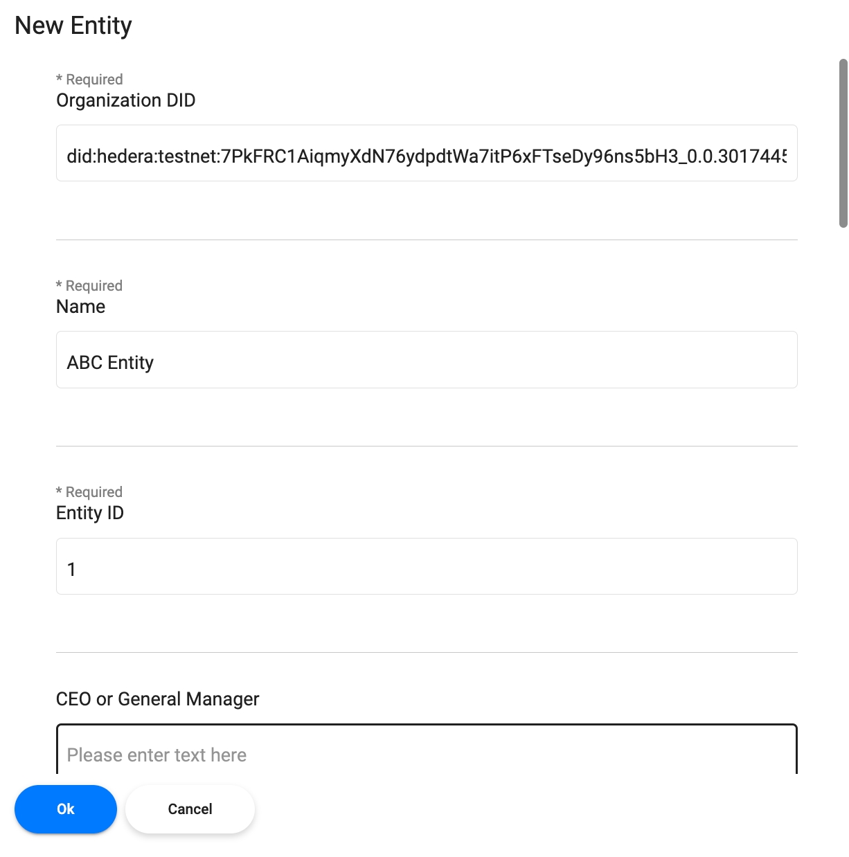 Once completed, add a new entity by clicking on the "New Entity" button and filling out the New Entity form.