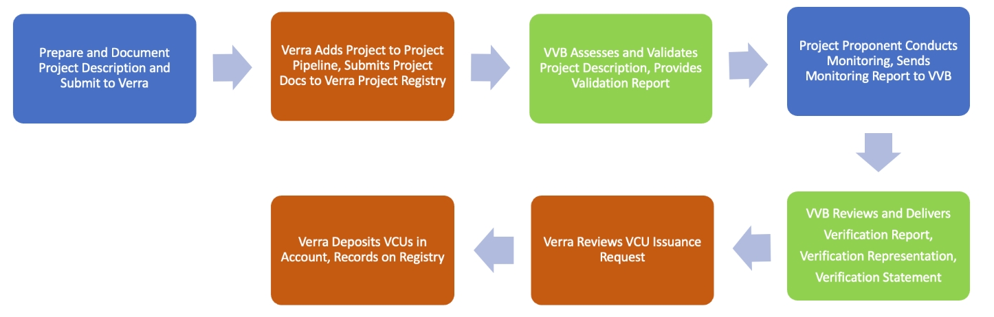 The workflow begins with the Project Proponent submitting the project description (PD) to Verra. The project description will include ex-ante estimates of the monitoring parameters, as well as other project details to demonstrate alignment with the VCS program requirements. Verra then adds the PD and project docs to the Project Pipeline and Project Registry. Next, the Validation and Verification Body (VVB) will assess and validate the PD and provide a Validation Report. Then the Project Proponent will conduct monitoring and develop a Monitoring Report, replacing the ex-ante estimates with ex-post MRV data and submitting it to the VVB. The VVB then verifies the Monitoring Report and delivers a Verification Report, Verification Representation, and Verification Statement. Finally, Verra reviews the issuance request, and VCUs are issued to the Project Proponent.