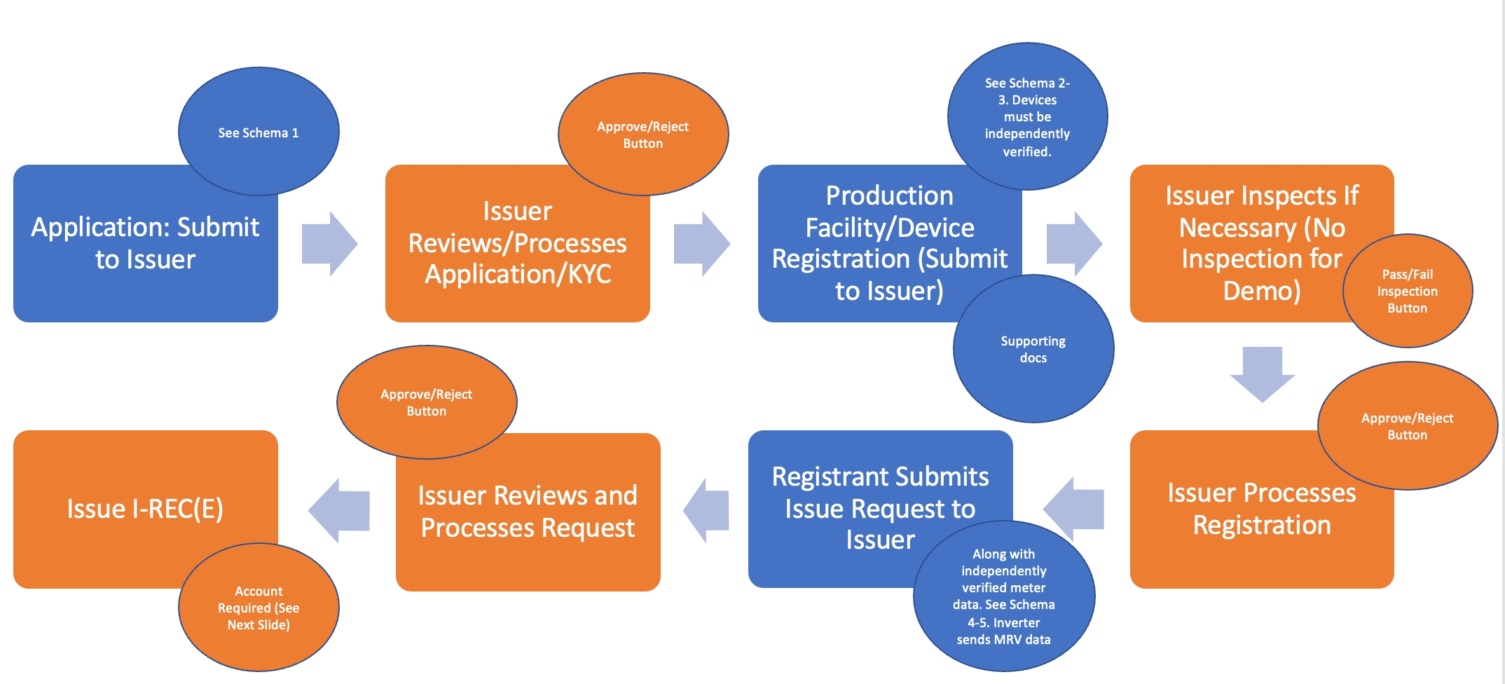 The workflow begins with the Registrant, generally the owner of an energy production facility or a party acting in their behalf, submitting an application to the Issuer for approval. Once approved, the Registrant submits a registration request to the Issuer for the facility/device that will be providing the MRV data. This will include both general information, as well as attributes (e.g., energy sources, location, etc.). Note that devices must be, and often are already, independently verified. Under certain circumstances an inspection may be necessary. Once the Issuer processed and approves the facility/device registration, an issue request can be sent to the Issuer along with independently verified meter data. After the Issuer approves the issue request, I-REC(E) certificates are issued.