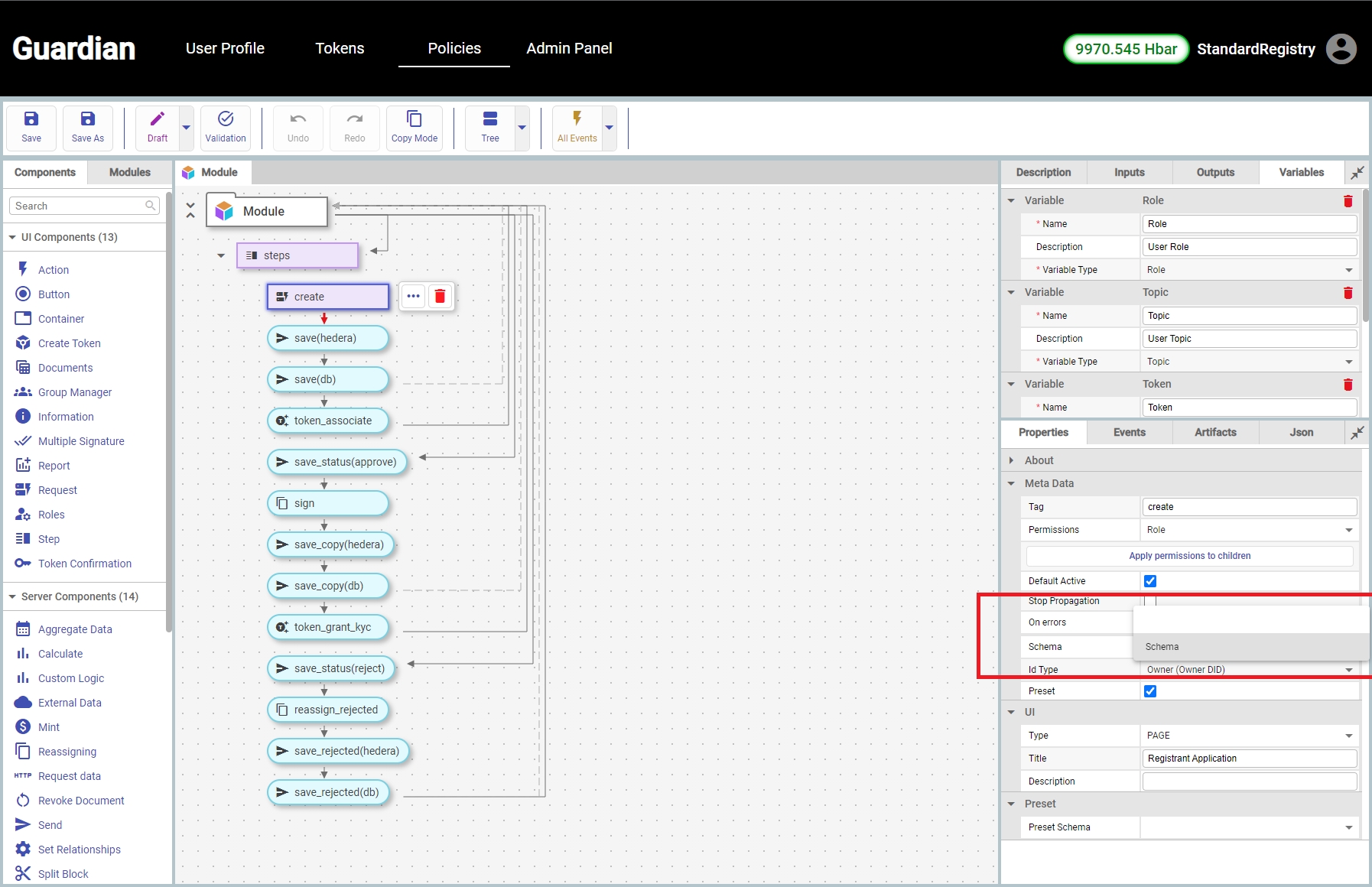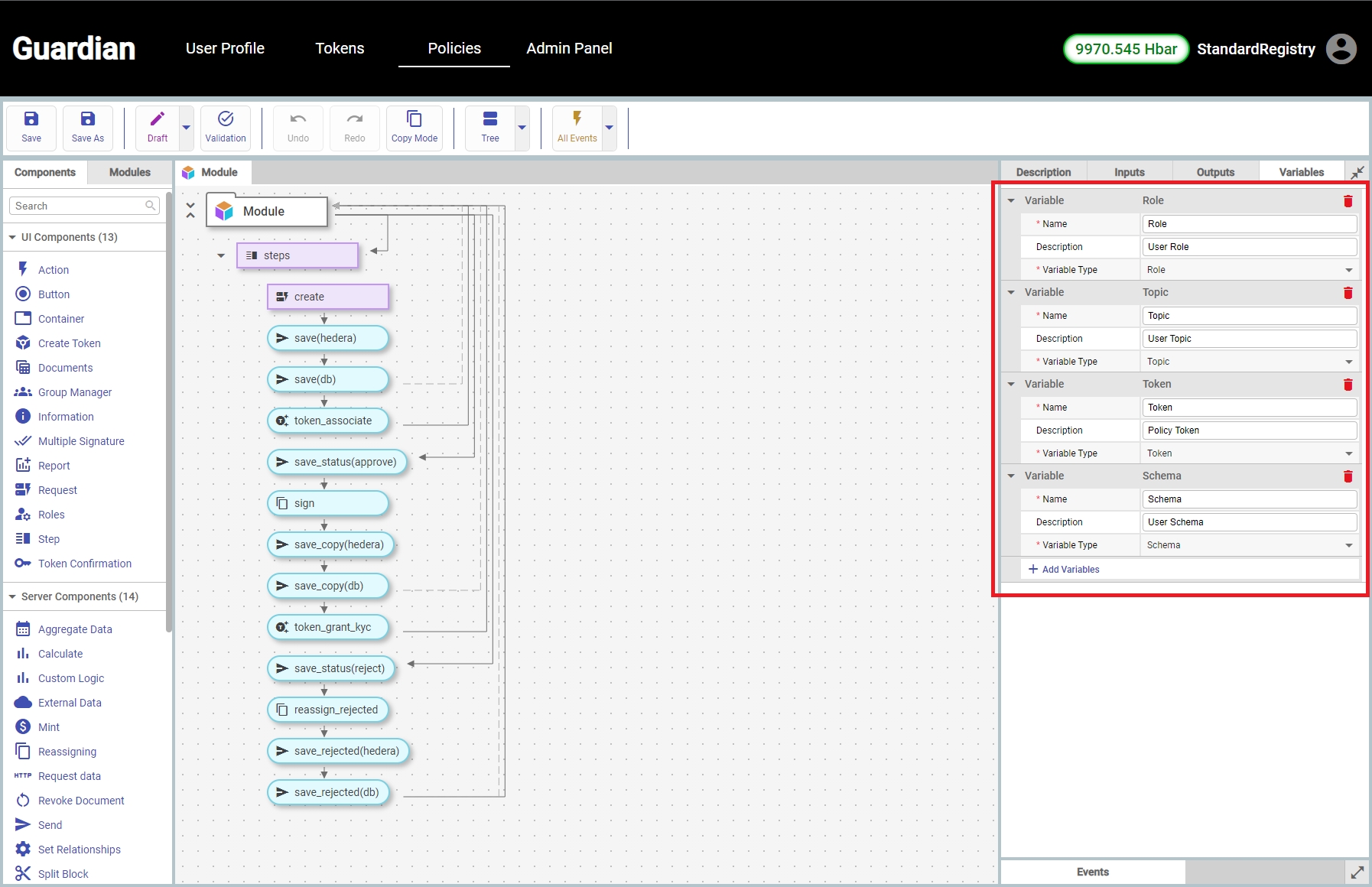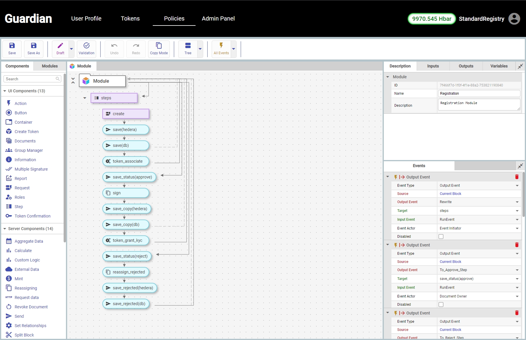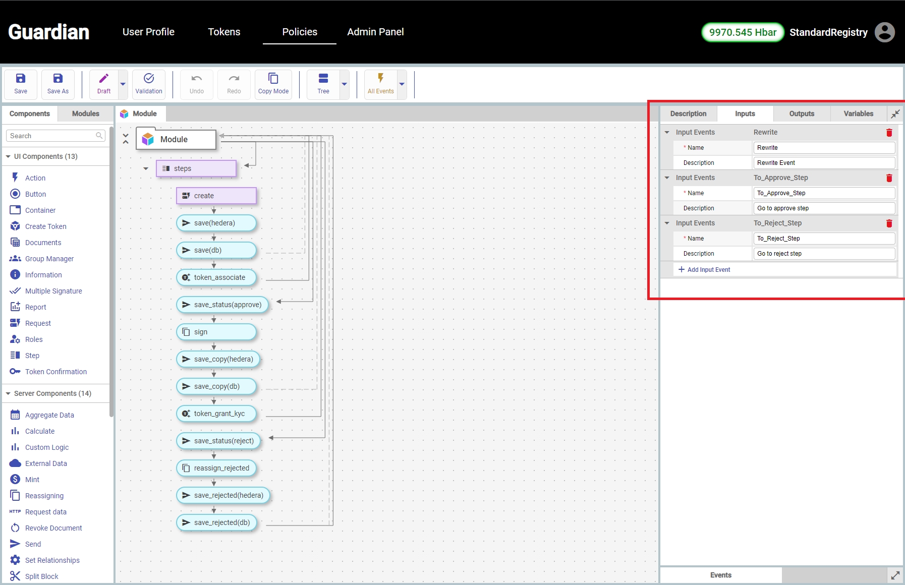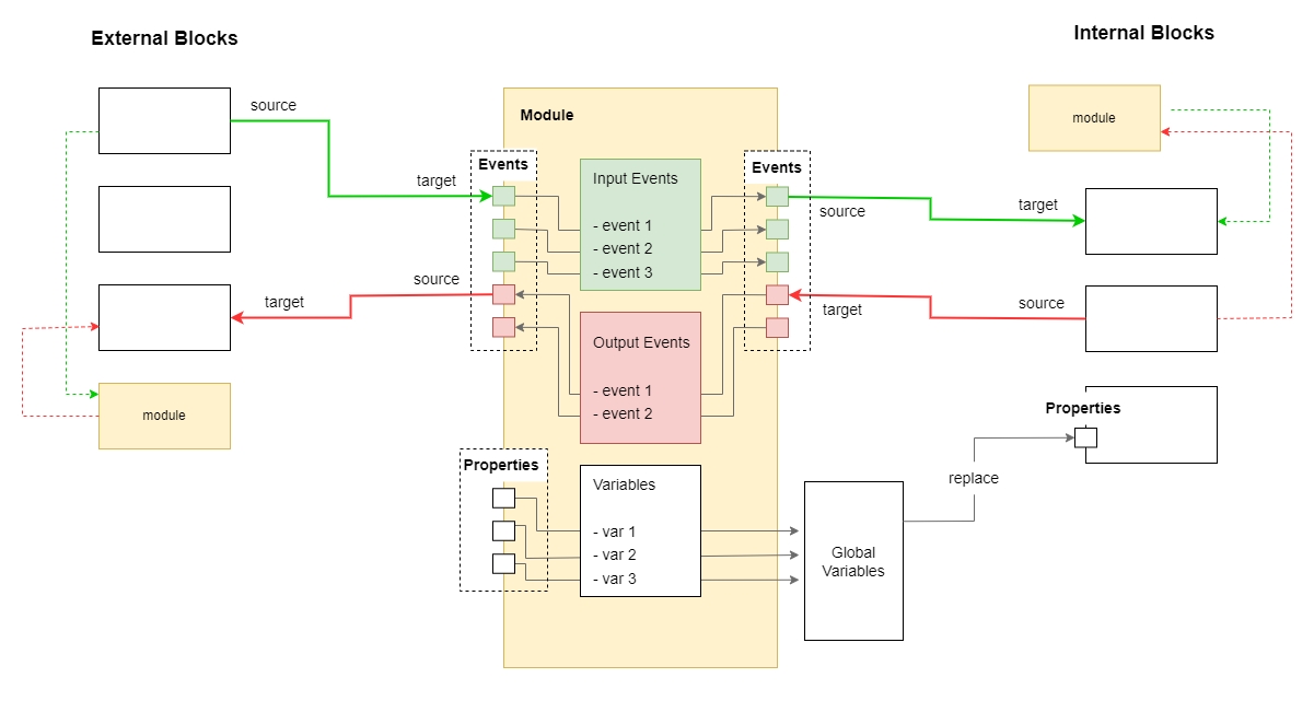 The ‘insides’ of modules are isolated from the rest of Policy it may be embedded into. The external view of a module is represented by Variables and Input\Output Events, which serve as an interface of the Module and transmit data into and out of the module.