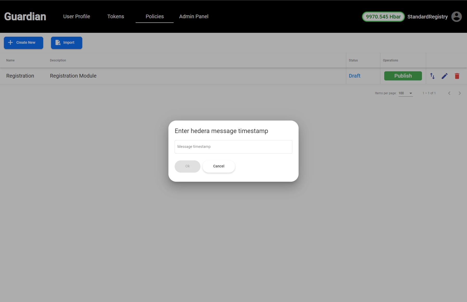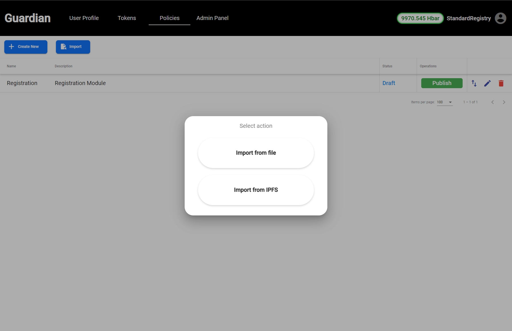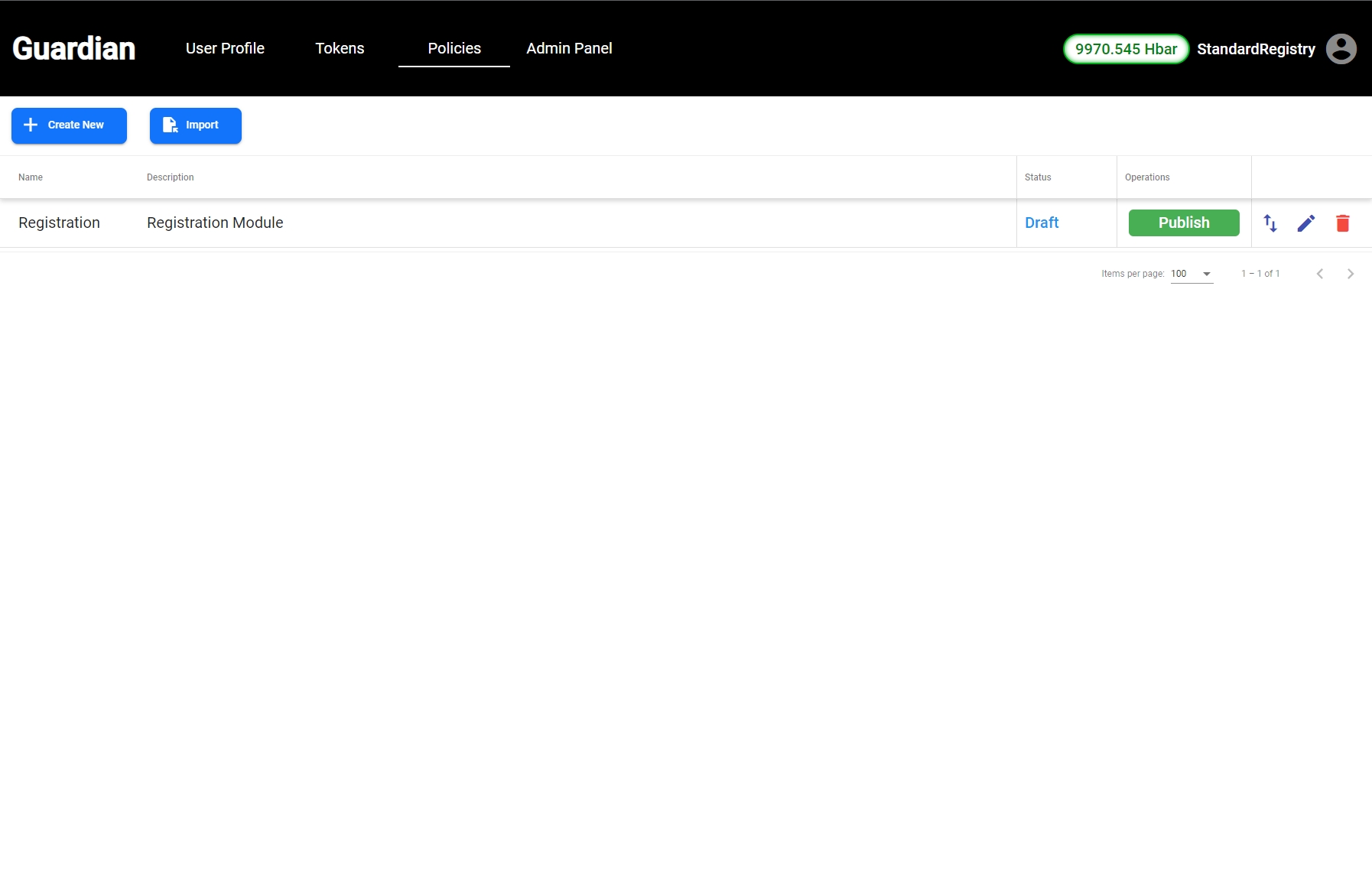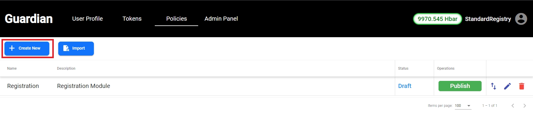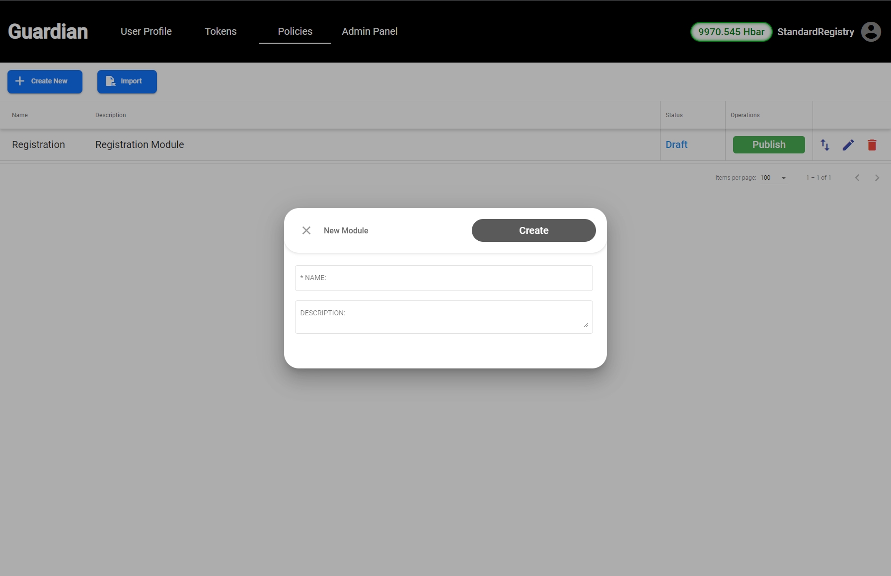 Modules can be created via the Modules management page in the Guardian UI by clicking on Create New button as shown below: