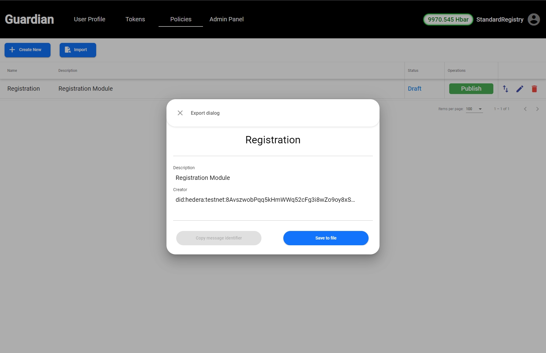 Modules can be exported as files or/and ‘published’ into IPFS. For published modules users can retrieve its messageId which can serve as a reference for import elsewhere.