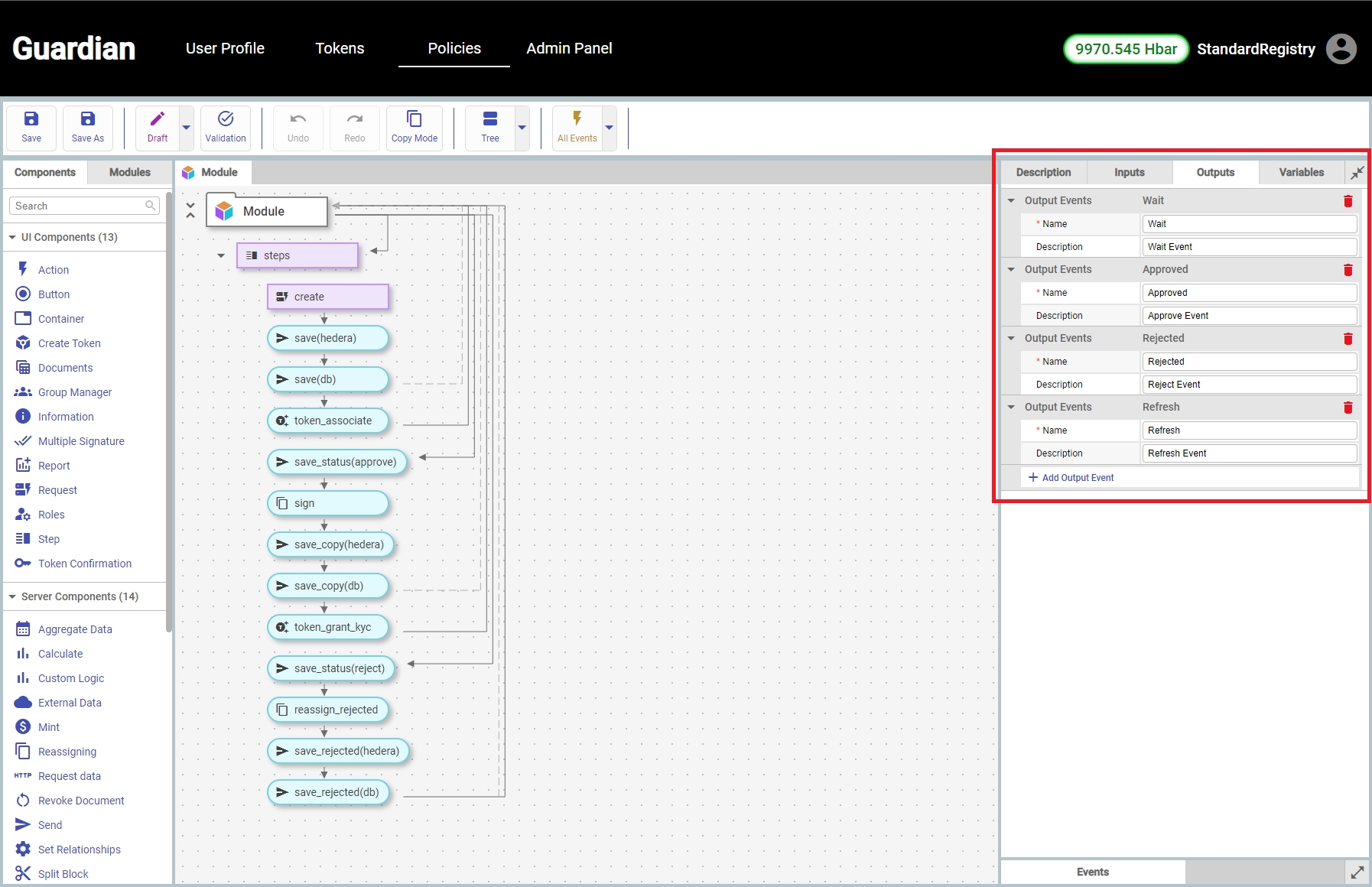 Similarly to Variables, Input\Output Events are the second part of the interface for Modules. Events define which events this module will receive from and send to other block in the Policy (external to the module).