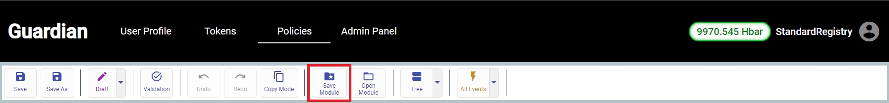 Saved modules can be found in the left-hand panel in the Modules section of the UI. They can be used similarly to the ordinary Policy blocks.