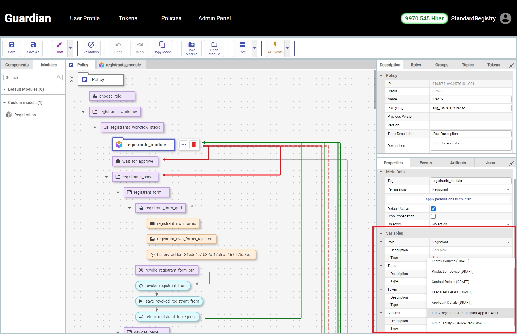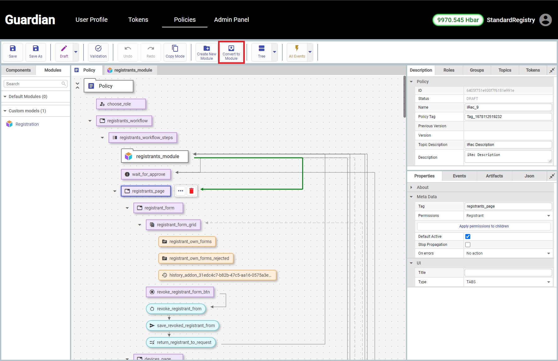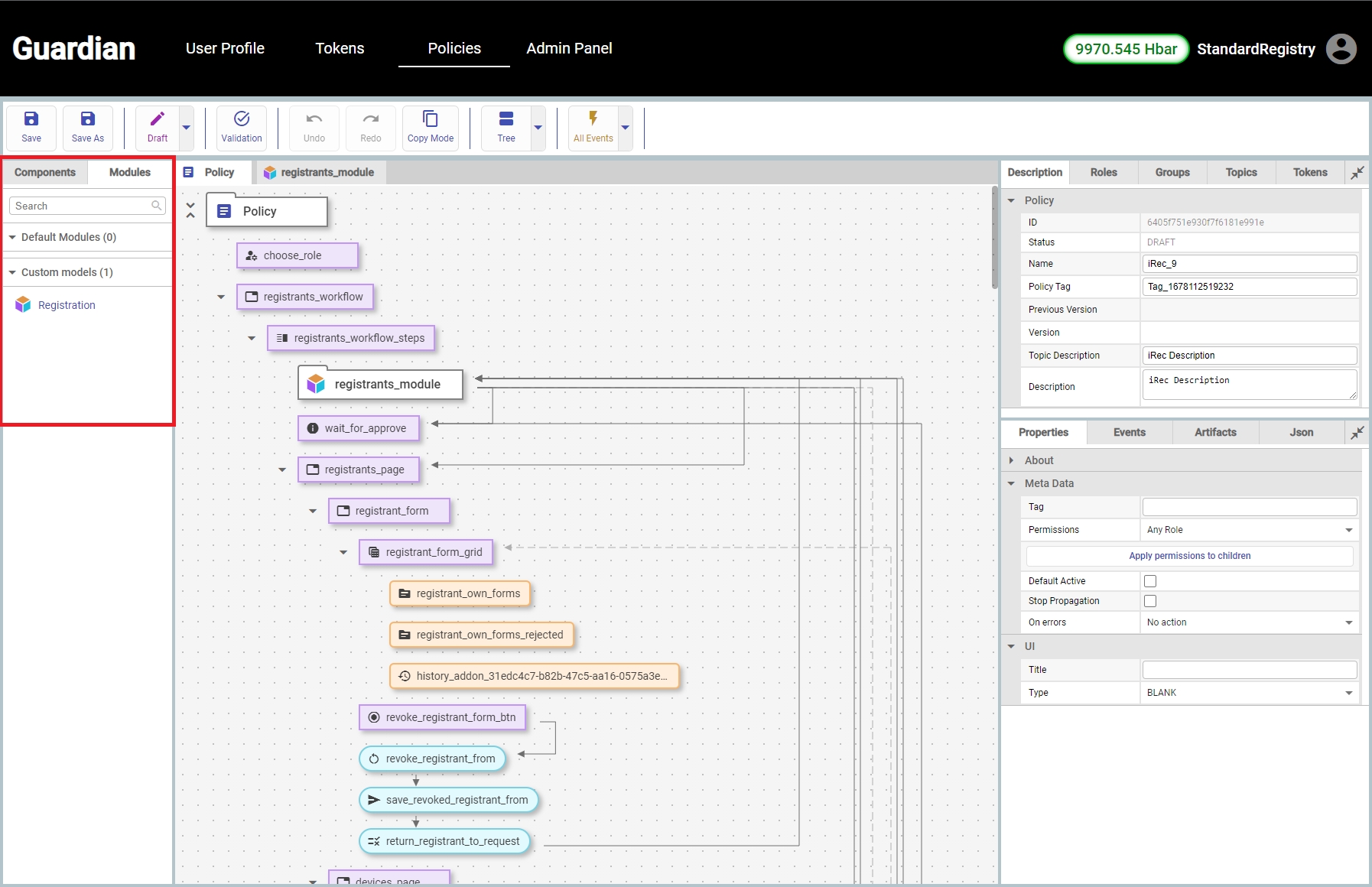 Policy Modules are large-scale components of the policy containing multiple blocks and internal events. Modules expose external interfaces through which they interoperate with the rest of the policy (blocks).