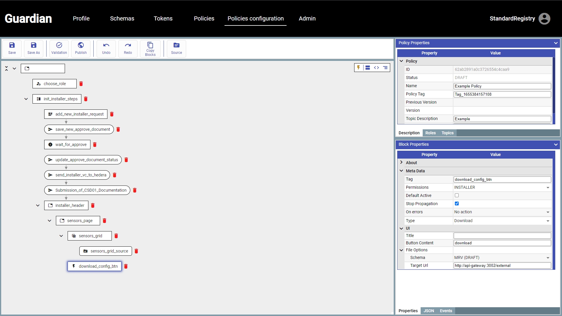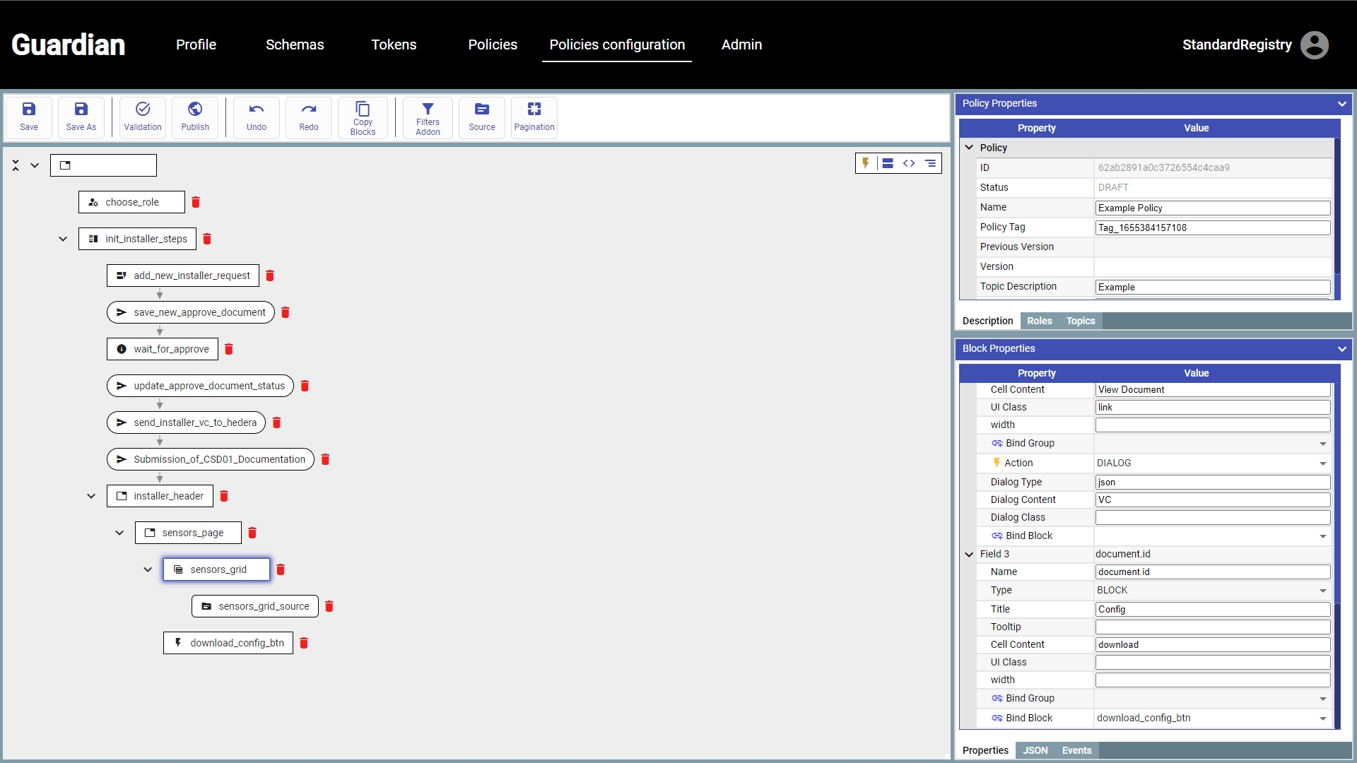 To do that, we click on the “sensors_grid” button, and then click on “Bind Block” for Field 3 and select the “download_config_btn” action to bind the action to the actual definition of the button.