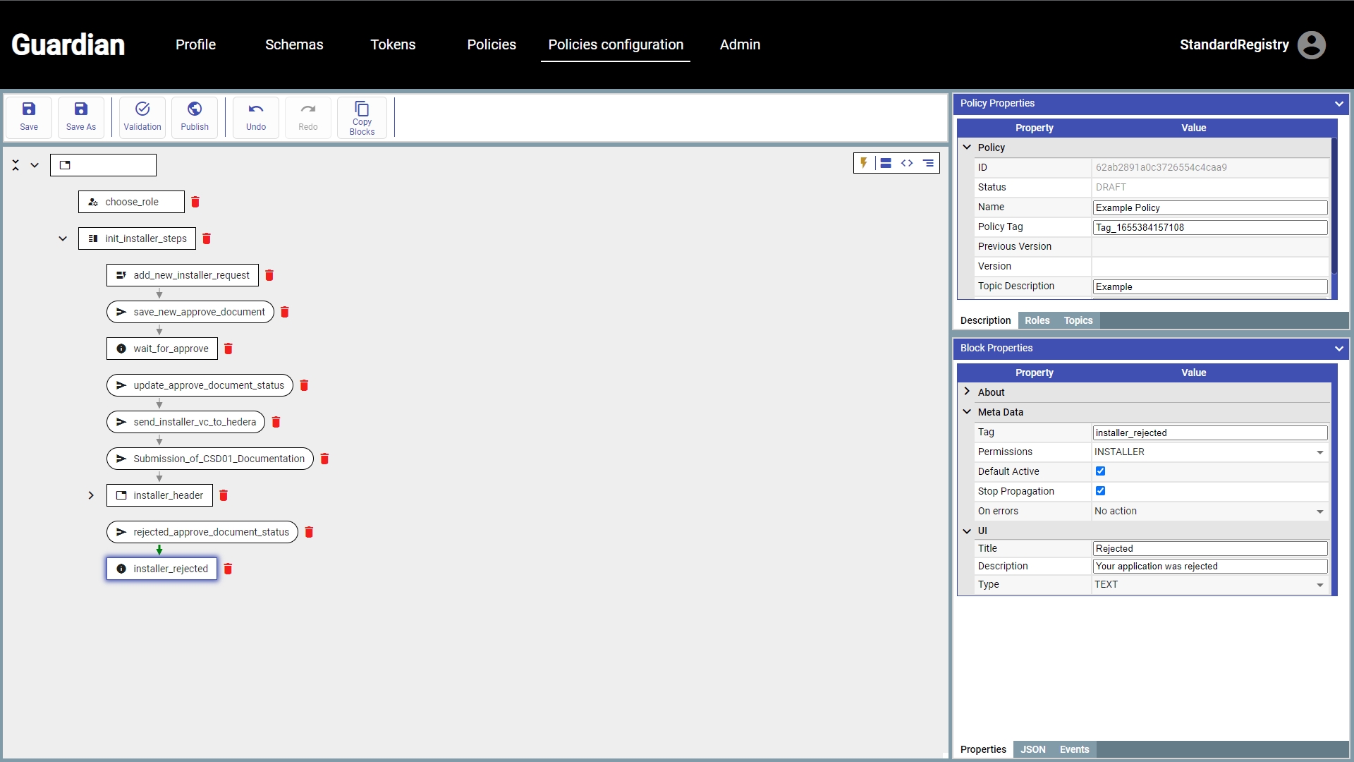 Next, we need to add an information block to our policy to specify what happens if the application is rejected by clicking on the information button in the top navigation bar.