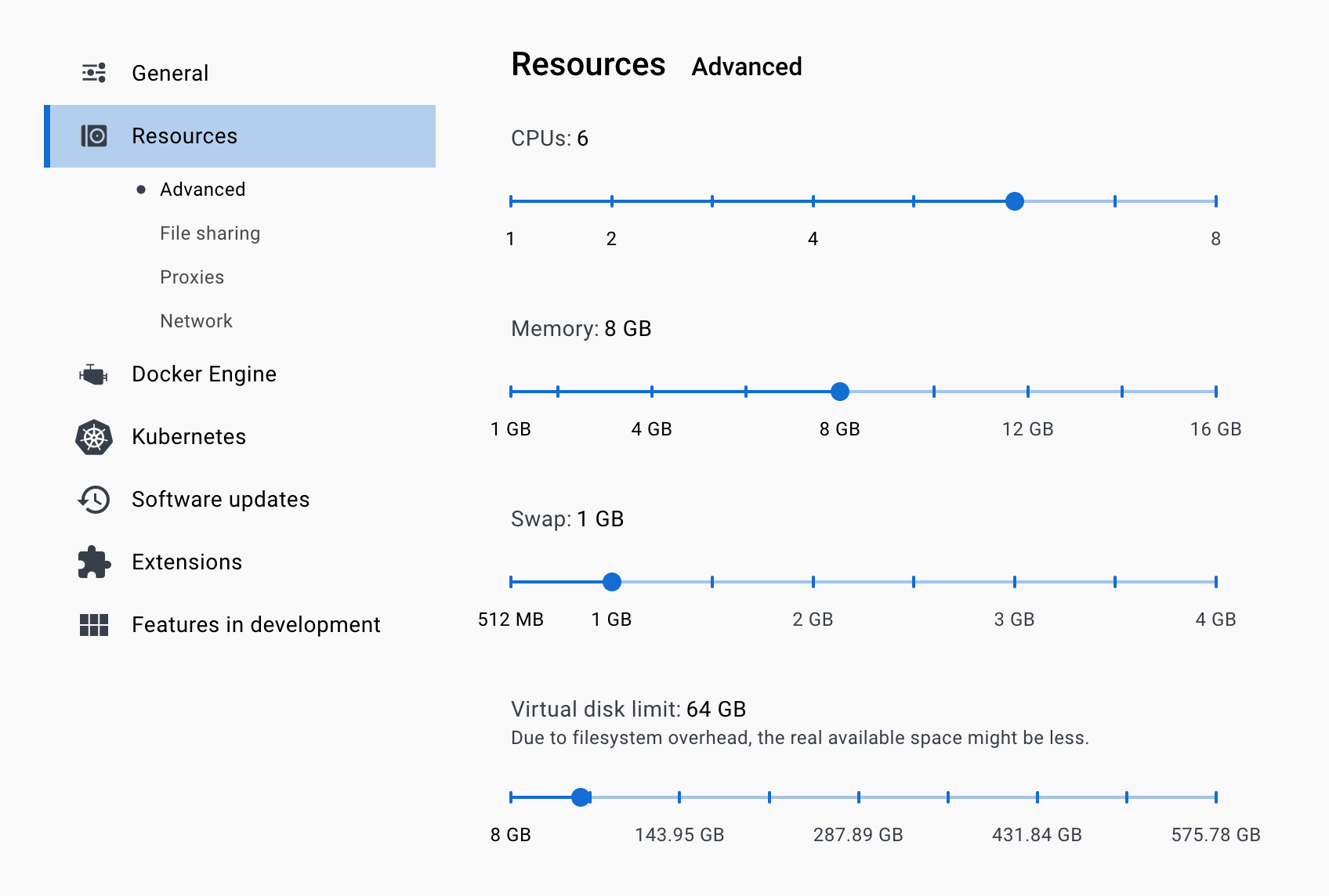 Ensure the following configurations are set at minimum in Docker Settings -> Resources and are available for use:CPUs: 6Memory: 8GBSwap: 1 GBDisk Image Size: 64 GB