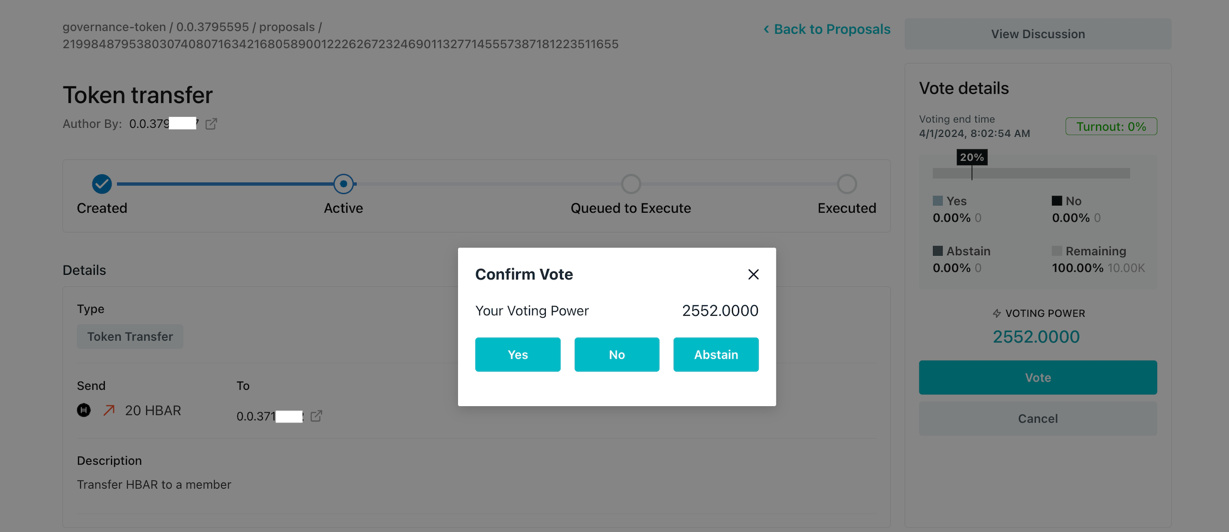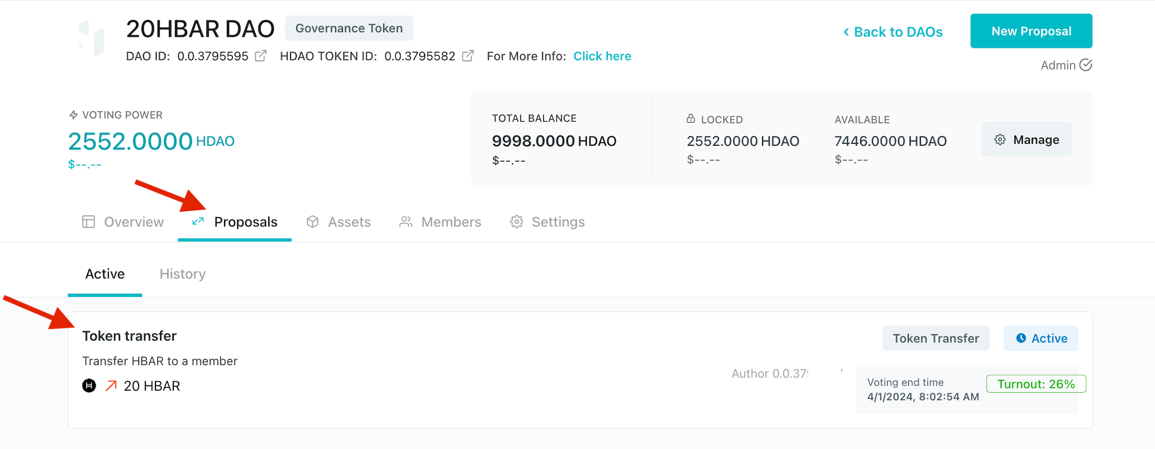 To vote on a proposal, first ensure that your wallet is connected and have voting powers. Navigate to the Proposals tab on the DAO’s dashboard and choose one of the active proposals to vote on.