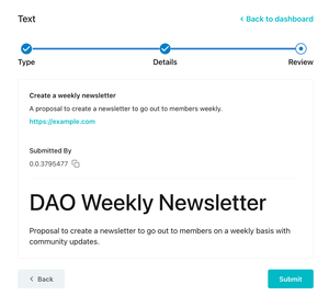 This Text proposal transaction is proposing to create a newsletter to go out to members of the DAO on a weekly basis.