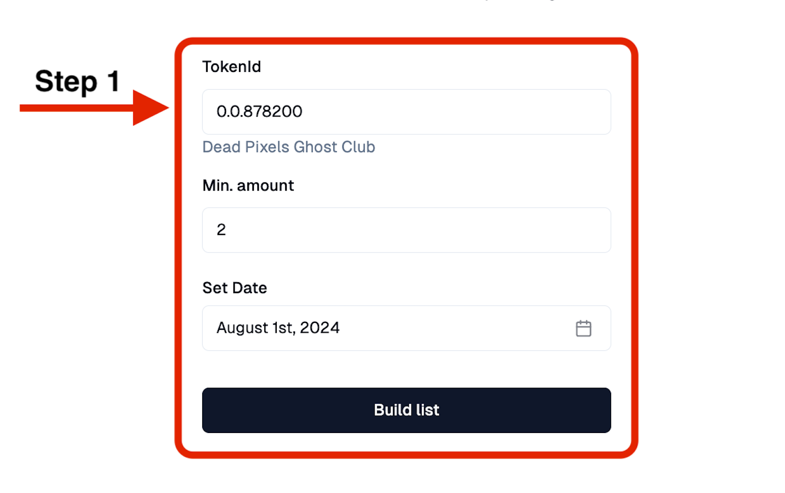 We will use the Dead Pixels Ghost Club (0.0.878200) collection as an example for this short demo. Input the token ID (required) of the NFT collection to generate a snapshot of all token holders.